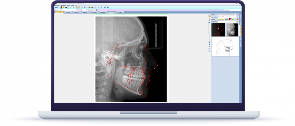 Ob Röntgen-, Foto- oder 3D-Aufnahmen – die Auswertung erfolgt direkt aus der Patientenakte. Vielfältige Darstellungsmodi erleichtern die Befundung und machen Ihre Ergebnisse auch für Patienten anschaulich. Über 100 Analysevorlagen geben Ihnen die Sicherheit, immer die passende Grundlage für Ihre Behandlungsplanung zu nutzen.