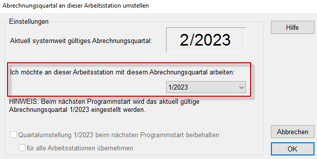 Wenn Ihre Praxis die Quartalsabrechnung für 1/2023 erst ab dem 01.04.2023 durchführt, wechseln Sie in ivoris® an der entsprechenden Arbeitsstation über Zusätze/Abrechnungsquartal in das Quartal 1/2023 zurück: