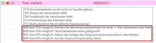 Es liegen Fehlermeldungen des Prüfmoduls vor, welche den Datenträgeraustausch verhindern „Kein DTA …“, die sich nicht auf das Lesen der eGK, sondern auf die erfassten Leistungen beziehen: