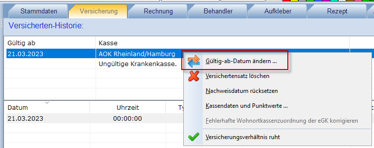 In diesem Falle wechseln Sie in Patientenstammdaten/Versicherung und tragen über die rechte Maustaste als Gültig-ab-Datum den 01.01.2023 ein:
